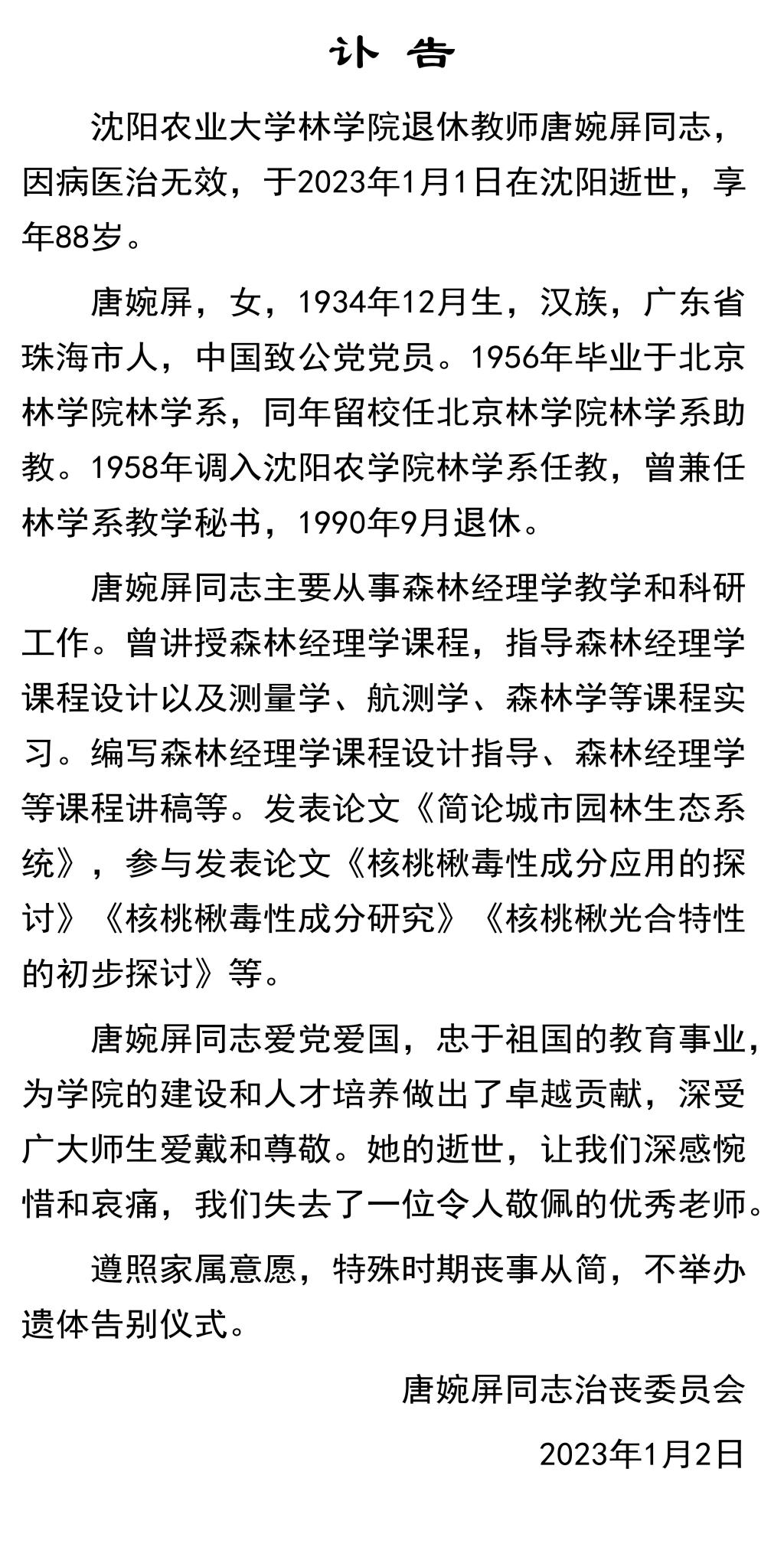 唐婉屏同志讣告