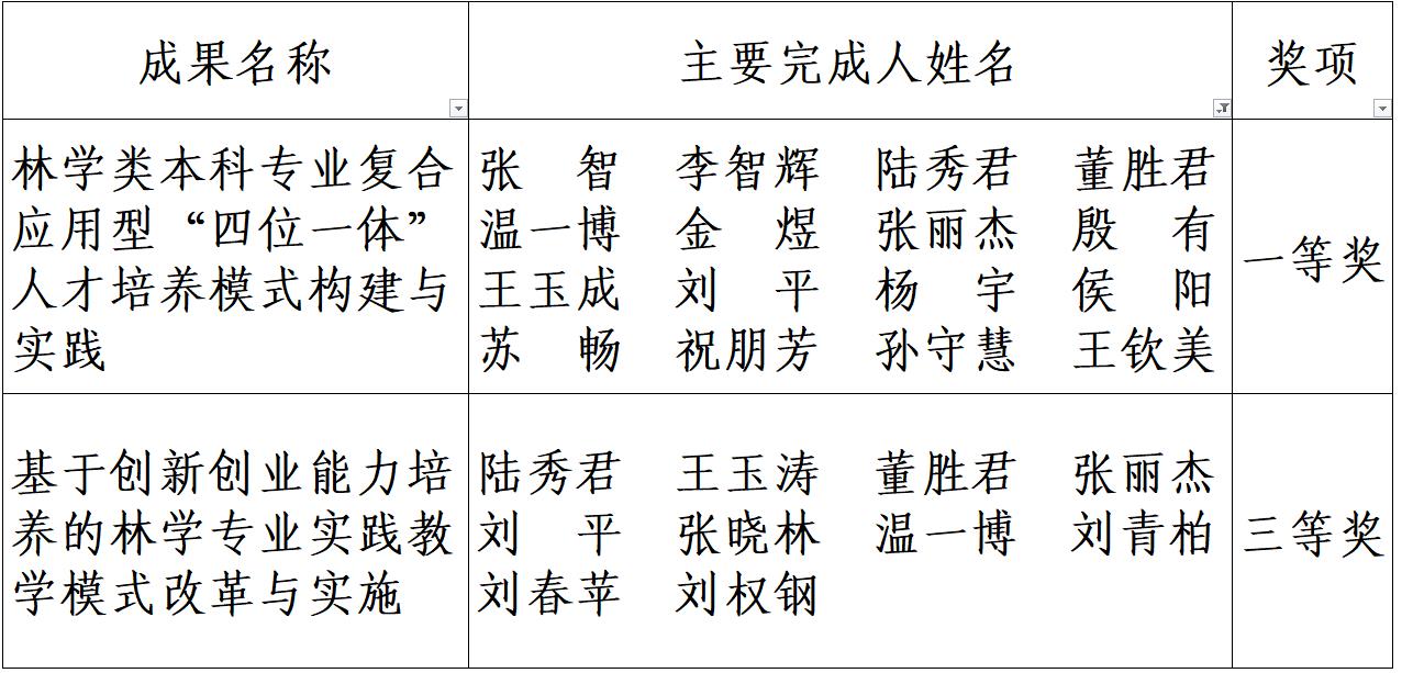 园林专业张智副教授主持的《林学类本科专业复合应用型“四位一体”人才培养模式构建与实践》获得一等奖。该成果团队自2014年开始,针对我院园林和林学本科专业,完成了辽宁省园林专业向应用型转变试点专项和5项省级教改项目,构建了“厚基础、精专业、强实践、重创新”的林学类本科专业复合应用型“四位一体”人才培养模式,推动我院园林、林学专业实现了跨越发展。