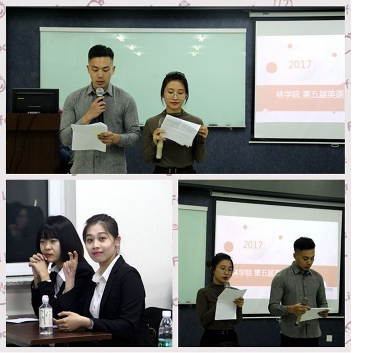 林学院在2017年10月12日18:00举行了第五届研究生英语口语大赛,参赛的评委有王刚书记、高云部长、杨柳老师、王青娜老师和武哲羽学姐等。在研会成员的严谨精心准备下,大赛圆满成功!