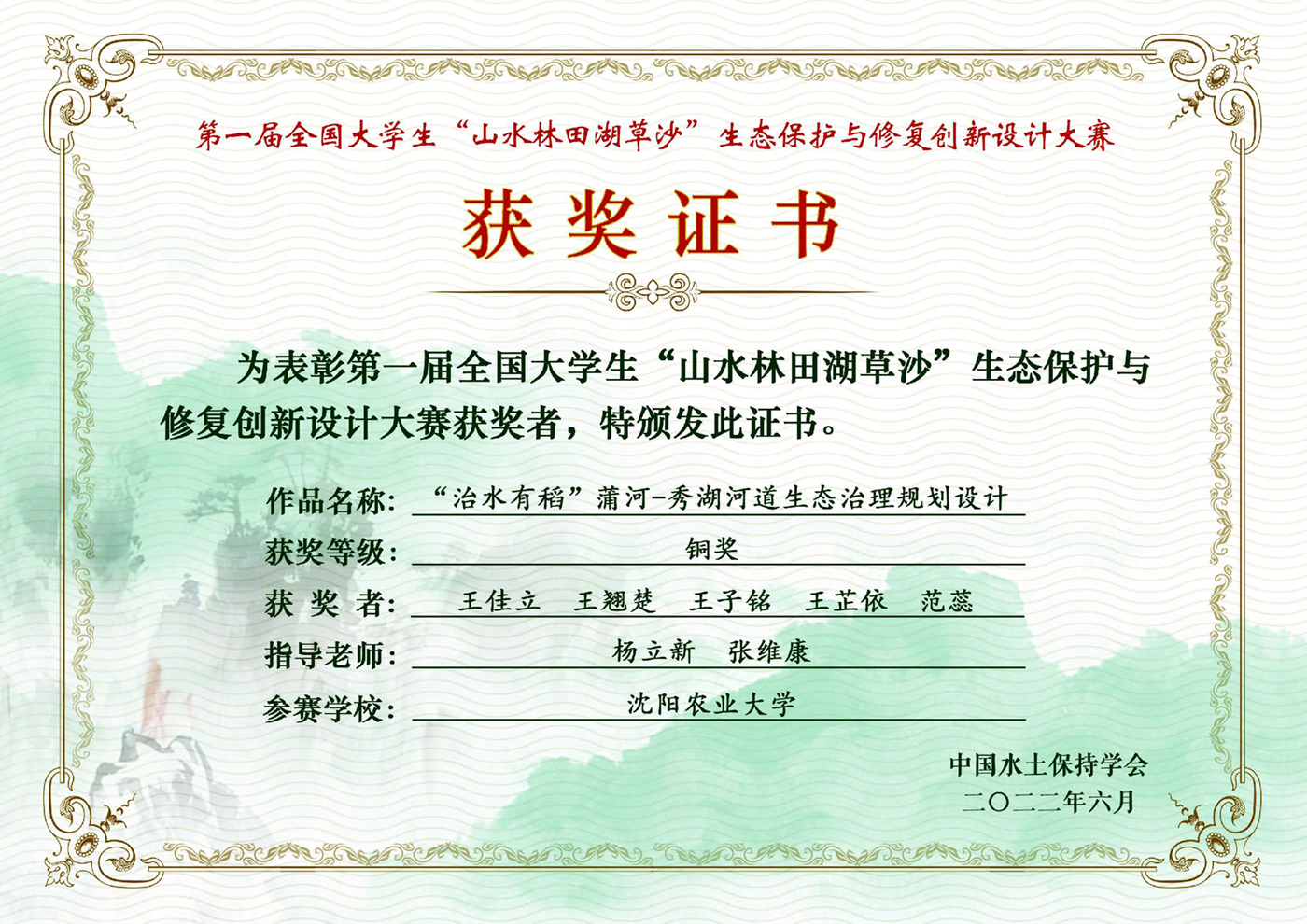 近日,在首届全国大学生“山水林田湖草沙”生态保护与修复创新设计大赛决赛中,我院风景园林学科教师杨立新、张维康指导研究生王佳立、王翘楚、王子铭、王芷依、范蕊完成的作品斩获铜奖。