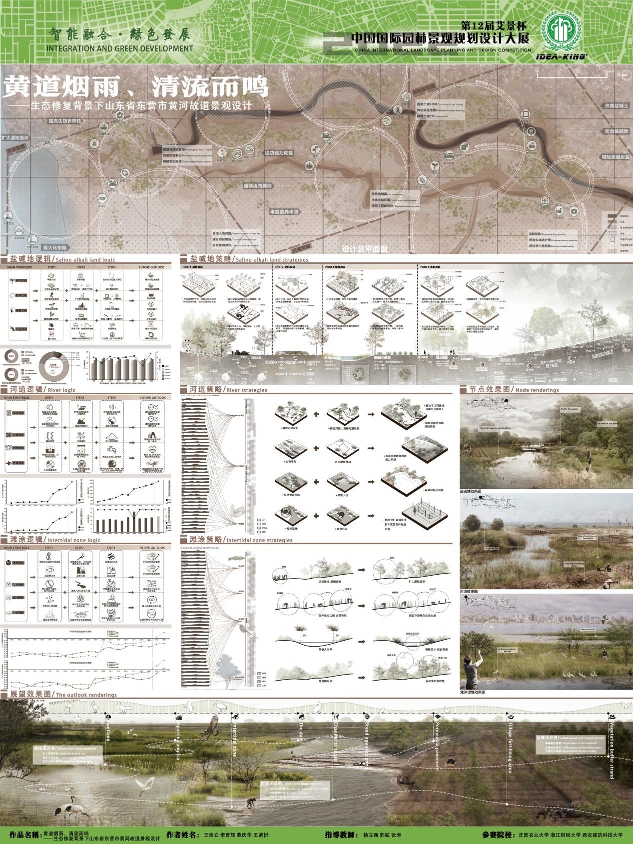 沈阳农业大学为第一完成单位,2021级风景园林专硕王佳立为第一完成人,杨立新副教授为第一指导教师的参赛作品《黄道烟雨、清流而鸣——生态修复背景下山东省东营市黄河故道景观设计》针对山东省东营市刁口河段黄河故道存在河道萎缩、土壤盐渍化和生态质量下降等问题,以营造烟雨朦胧、水清鸟鸣、生机盎然的自然景观为设计目标,基于生态规划原理,采用工程技术手段,试图通过适应自然环境的生态改造,建立天人合一人地和谐关系,保护当地生物多样性。该作品在高校组网络投票中排名第一,并最终获评金奖。