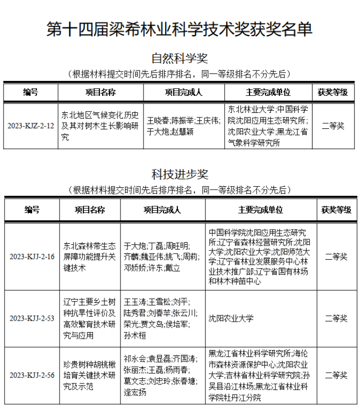 近日,中国林学会公布了第十四届梁希林业科学技术奖评选结果,我院教师王玉涛主持完成的1项成果及张丽杰、魏亚伟参与完成的2项成果荣获科技进步二等奖,陈振举参与完成的1项成果荣获自然科学二等奖,获奖项目数创历史新高。