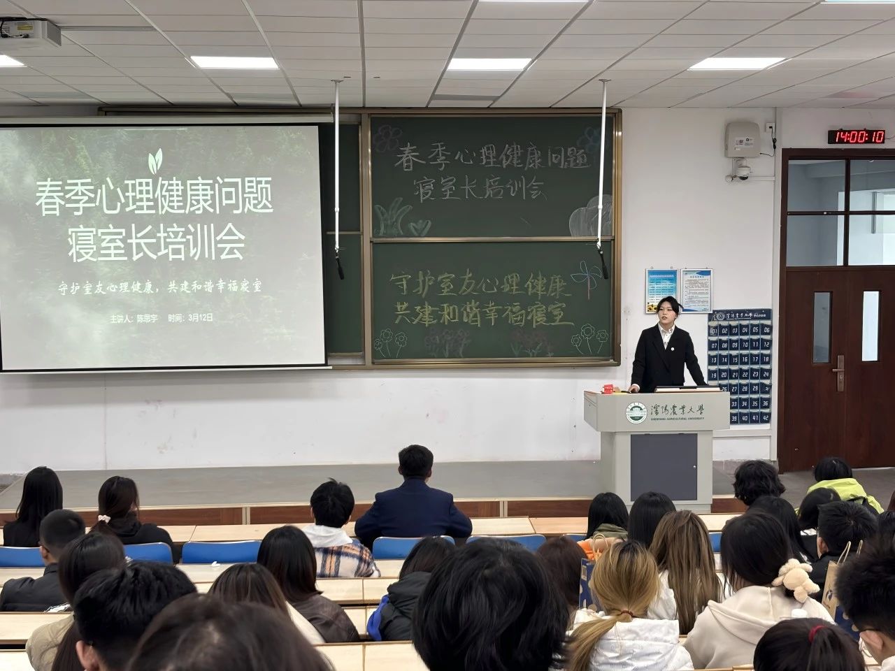3月12日,林学院在1教南区202,召开心晴使者和寝室长培训会。会议中,学院心理发展部负责人陈思宇讲述了心晴使者和寝室长的角色与责任,为什么春季是心理健康问题的高发期,如何关注室友状态以及当室友出现异常状态时如何应对等问题,会上,还对寝室长开展了有关寝室关系的问卷调查。