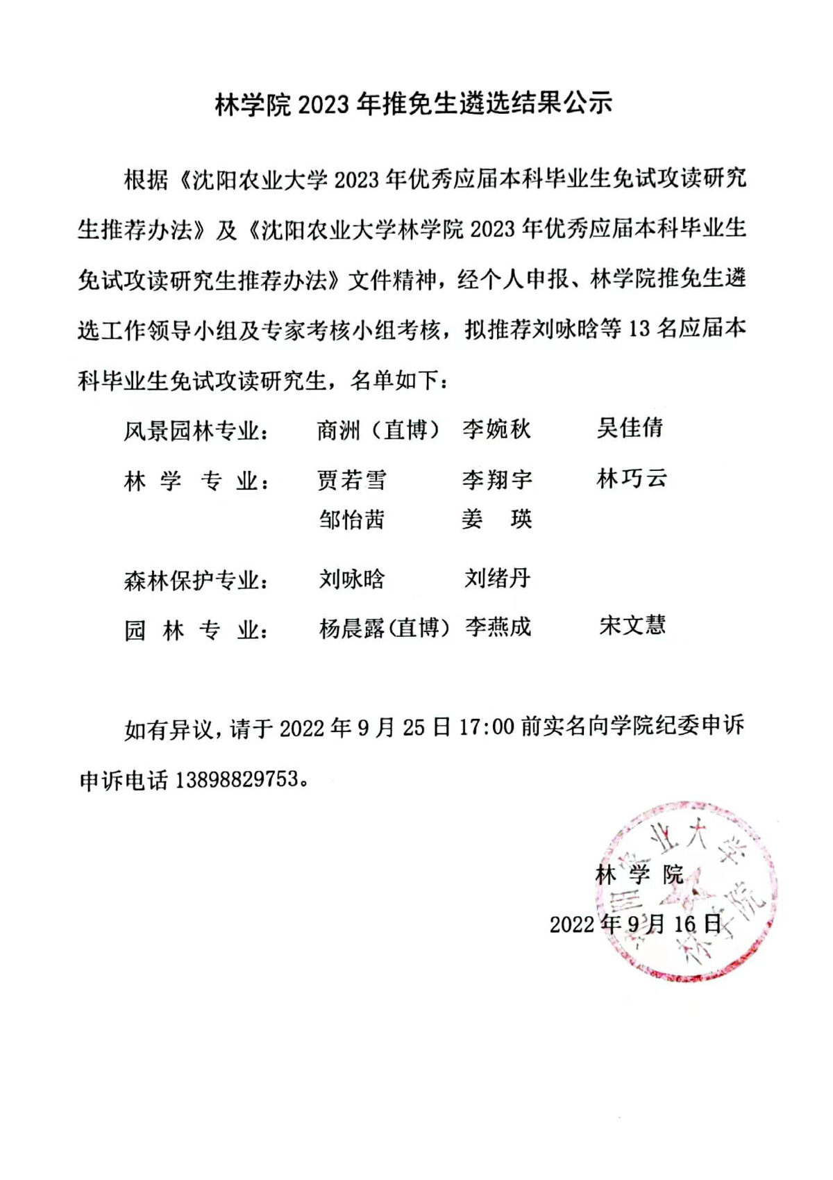 林学院2023年推荐免试研究生遴选结果公示