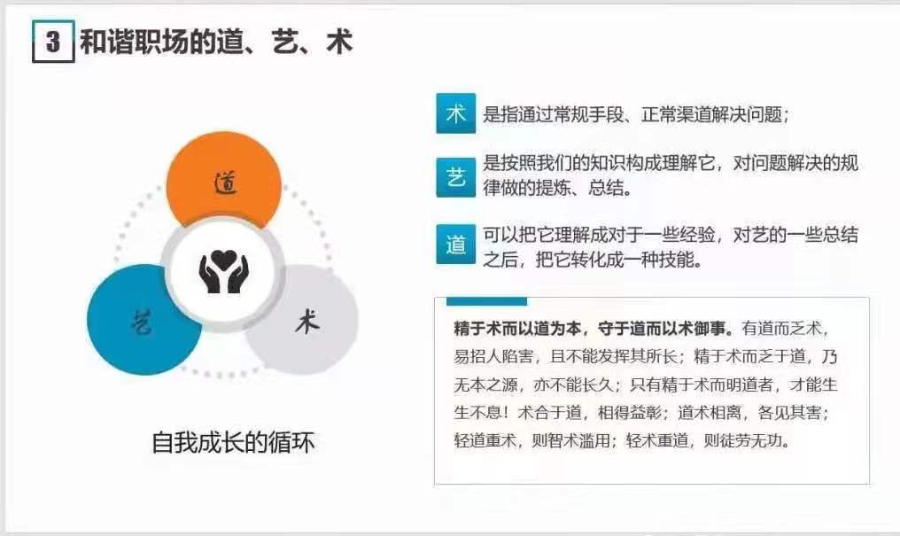 在工作中要高度掌握职业素养、职业规范、职业技能。要实现道,艺,术和谐的自我成长循环,精于术而以道为本,守于道而以术御事。同时我们也需要职业化的修炼比如说持有科学职业观念:热爱并且全心付出于你的事业。抱有阳光的职业心态:持积极心态面对生活与职场等等。掌握恰当的职业技巧以及技能是我们从学校步入社会的一块重要的敲门砖。