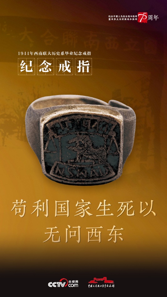 1943年,大批学生响应政府号召,投笔从戎,参加中国远征军、驻印军。将于1944年毕业的历史系学生,在毕业前入伍,从军前设计了此戒指,历史系全体学生通过,作为毕业纪念品。戒指正面中间为天平上以手执笔的图案意思为作史应秉笔直书不能有所偏袒;上部为“H D 1944 字样,意为“History Department 1944”及历史系1944级;下部为“N S W A U”字样,意为“National Southwest Associate University”即国立西南联合大学。
