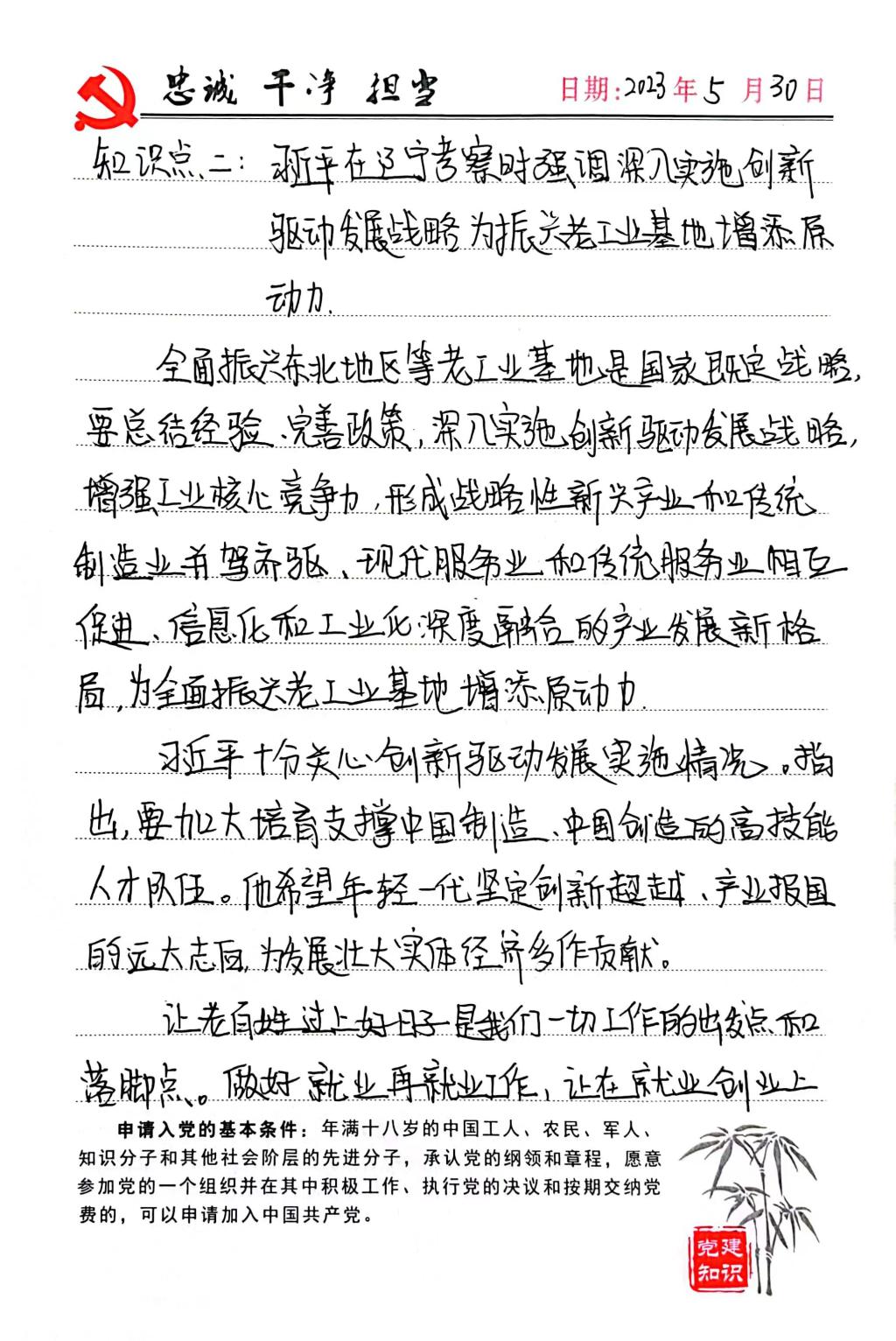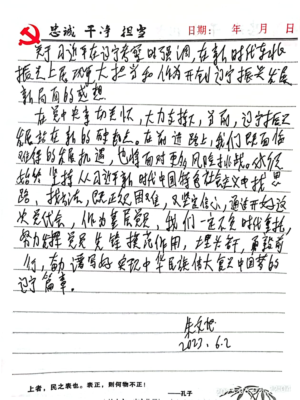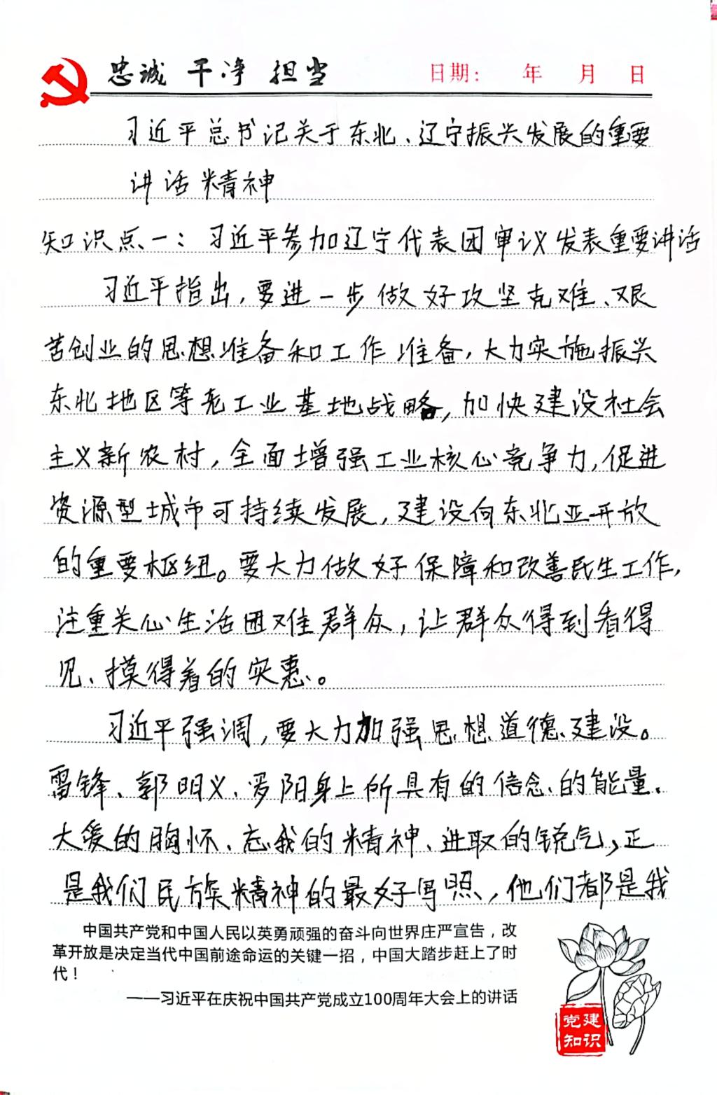 通过学习习近平总书记关于东北、辽宁振兴发展的重要讲话精神,让我明白振兴东北、振兴辽宁的重要性。全面振兴东北地区等老工业基地是国家既定战略,作为学生党员,我们要跟紧时代脚步,跟紧党中央号召,要讲诚信、懂规矩、守纪律、襟怀坦白、言行一致、心存敬畏、手握戒尺,对党忠诚。