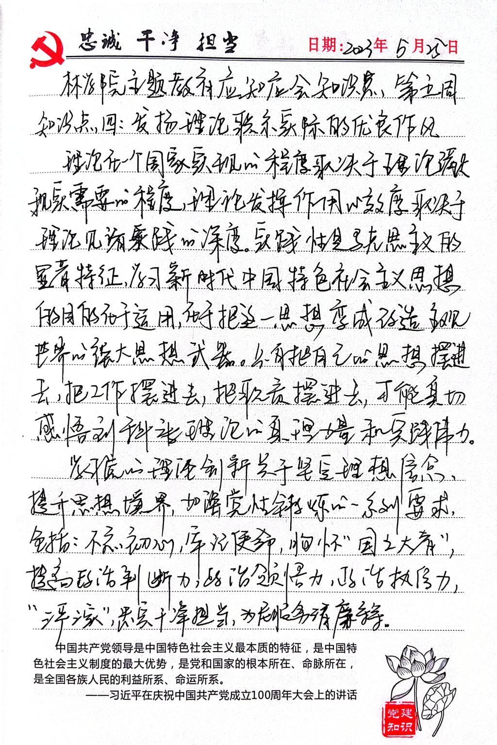 我们要发扬理论联系实际的优良作风,“不忘初心、牢记使命”。只有理论联系实际,才能真切感悟到科学理论的真理力量。作为党员,我们要将党的创新理论运用到贯彻落实党的二十大提出的重大战略部署中去,始终保持共产党人的政治本色。