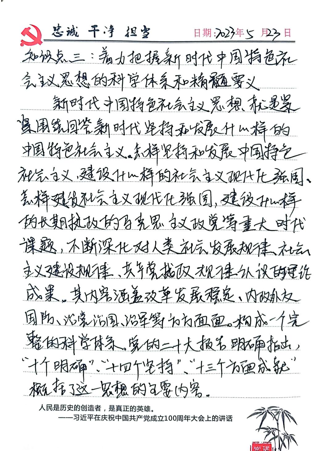 通过本次学习,我明白了在新时代新征程,面对错综复杂的国际国内形势,需要我们用习近平新时代中国特色社会主义思想武装自己,准确把握“六个必须坚持”,这样才可以把思想方法搞对头,认识问题才站地高,分析问题才看得深。我们要发扬理论联系实际的优良作风,只有把自己的思想摆进去、把工作摆进去、把职责摆进去,才能真切感悟到科学理论的真理力量和实践伟力。