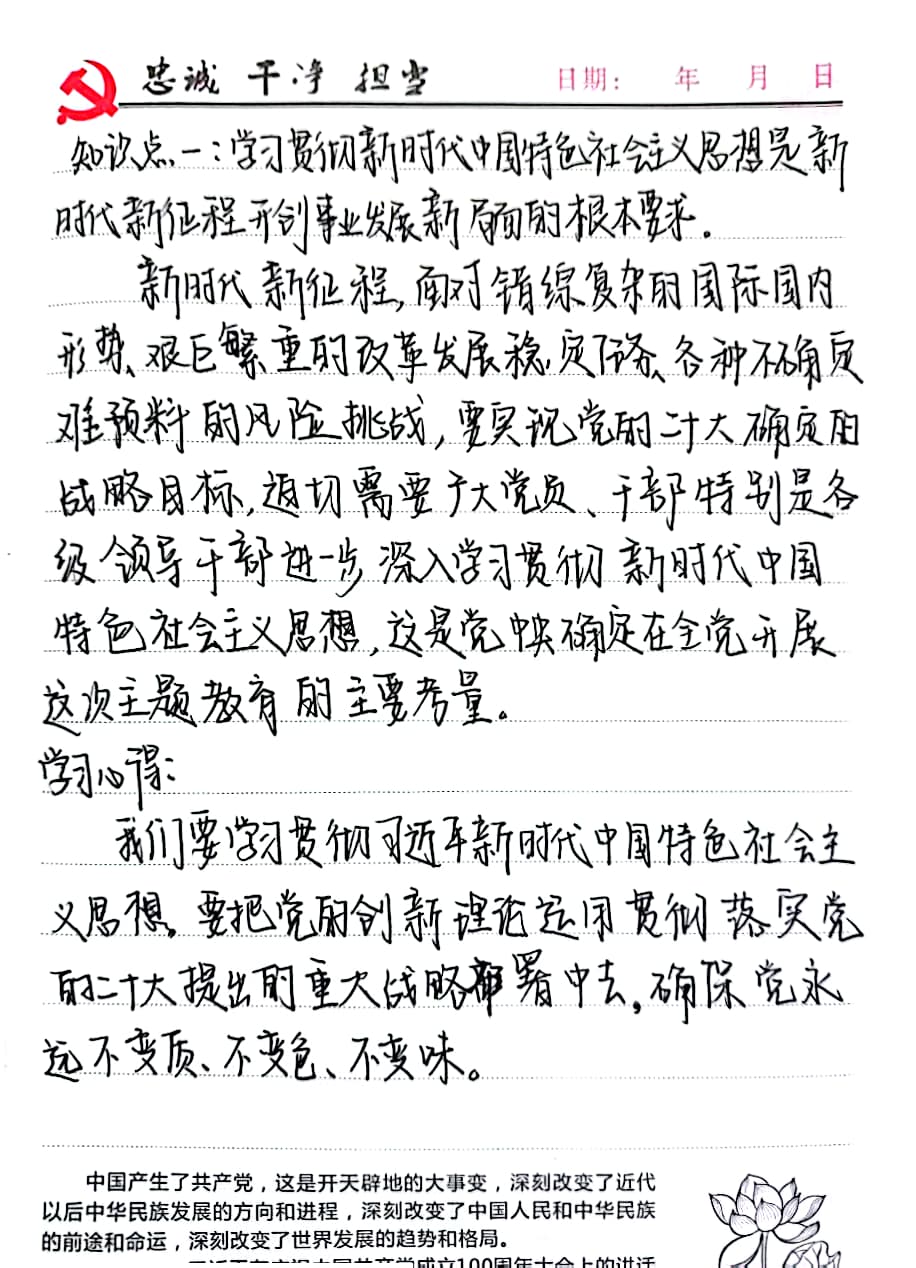 作为一名党员,我认真围绕“学思想、强党性、重实践、建新功”的总要求,切实把自己的思想和行动统一到主题教育和党的二十大精神上,强化理论学习,原原本本学、反反复复读,真正做到学深悟透,切实增强学习的积极性、主动性、自觉性,忠实履行新时代赋予青年的使命任务。