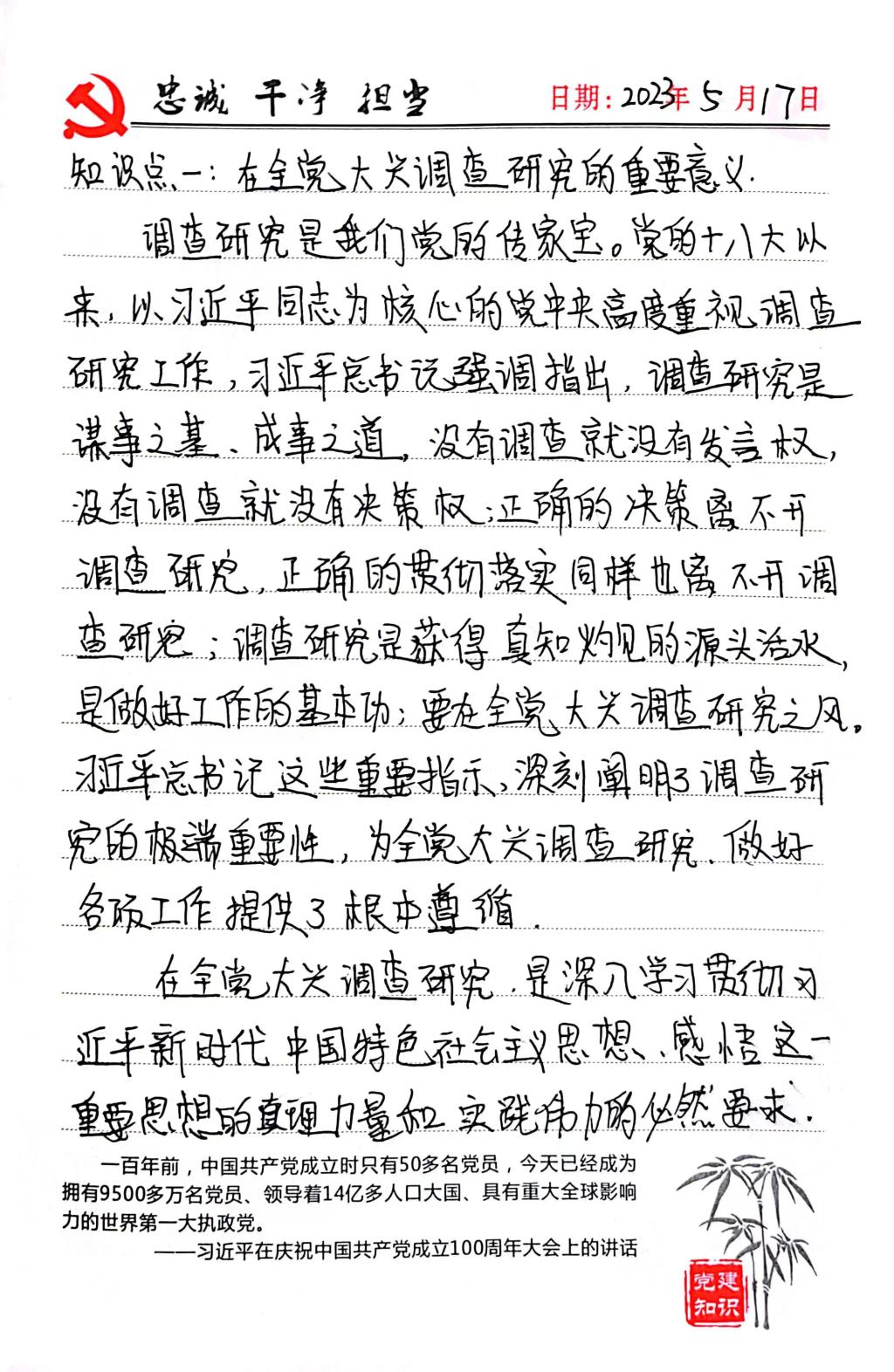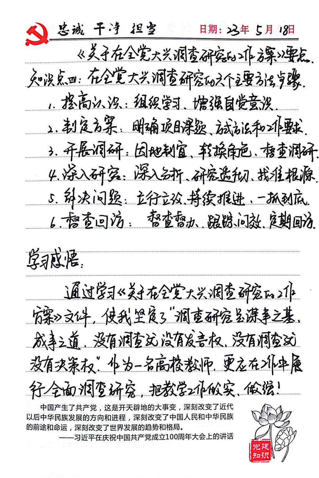 通过这一周的学习,我明确了在全党大兴调查的意义与总体要求。作为一名学生党员,我们在科研任务中也要做好调查研究,做好工作的基本功,在科研任务中也要严谨认真,做好前期工作才能作出正确的决策,为科研任务研究打下良好基础。