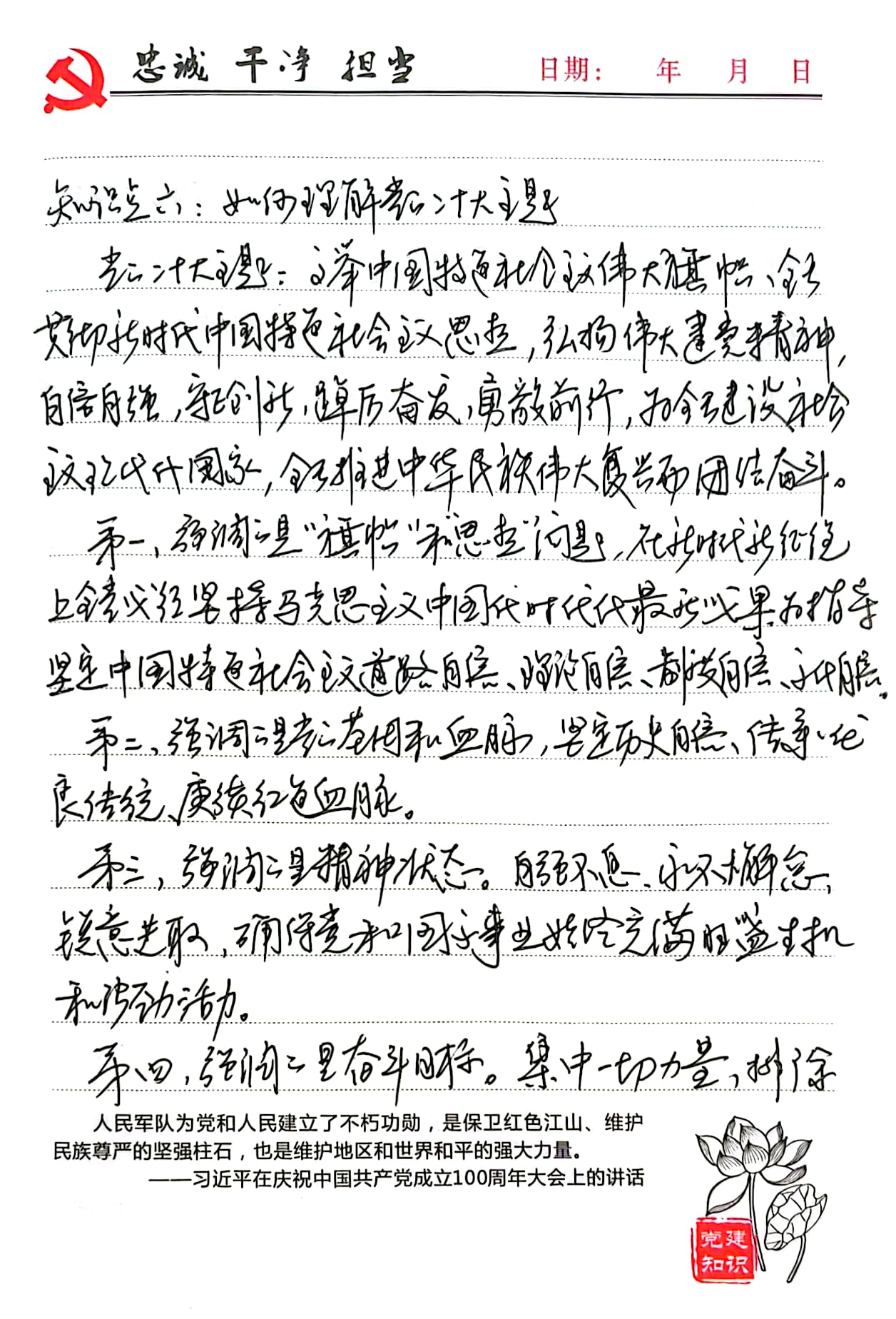 主题教育开展以来,我收获颇多。我热爱我的祖国,热爱中国共产党。我将时刻为理想而努力,牢固树立“为天地立心,为生民立命,为往圣继绝学,为万世开太平”的理想,不断强化自身专业能力,不断增强学习的主动性、创造性。我愿意以行动证明自己的决心,紧跟党的步伐,听党指挥,认真且努力塑造全新的自己。