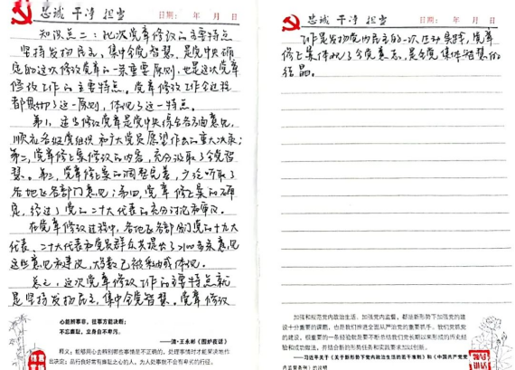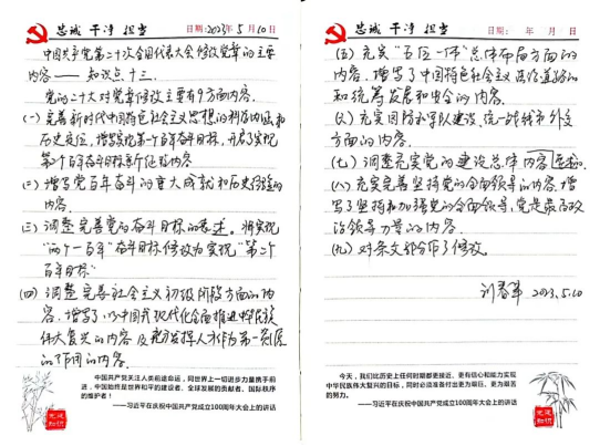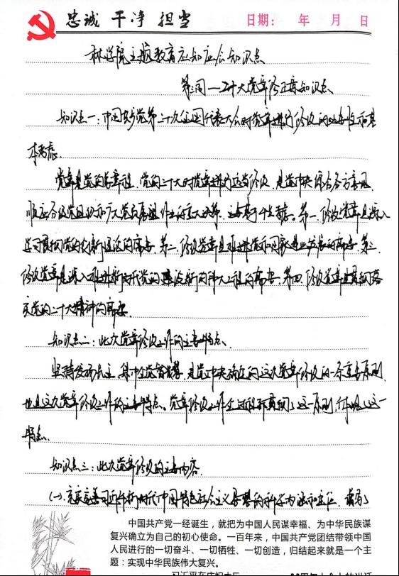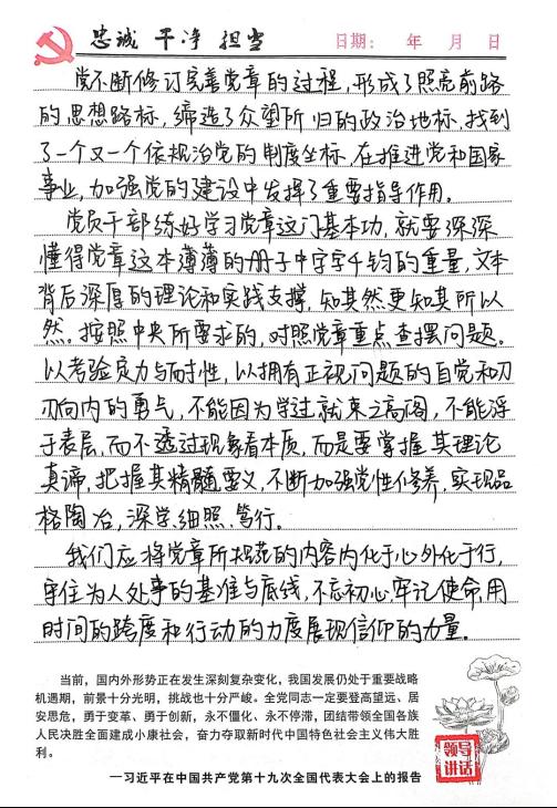 通过党章的学习,我对岗位工作有了更深层次的理解和认识。岗位上书写的是责任,上任就要扛起担子,负起责任。我在学习中对照、审视自己的岗位职责,按照党章要求,工作中敢于担当、积极作为,勇毅前行、攻坚克难。用对党绝对的忠诚、绝对的干净向学生展示这个社会最美好的一面;用中国发展的有力事实和生动案例,引导学生正确认识中国和世界发展大势,为学生服好务,为党育好人,为国育好才!