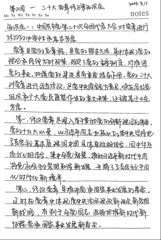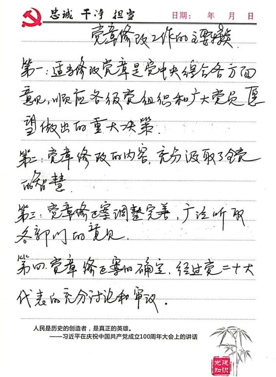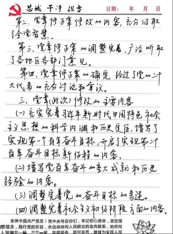 通过本次学习,认识到了党的二十大对党章修改的必要性,明确了党章修改的9个方面内容,未来工作中,要把党章学习作为经常性工作来抓,严格遵守党章,切实贯彻党章,坚决维护党章。