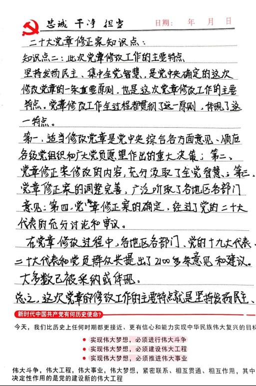 党的二十大对党章的修订,顺应时代的要求,符合党的发展实际,充分展现了马克思主义执政党与时俱进的理论勇气和勇于自我革命的鲜明品格,她像一团烈火推动着青年力量向前奔跑,引领着我前进的方向。